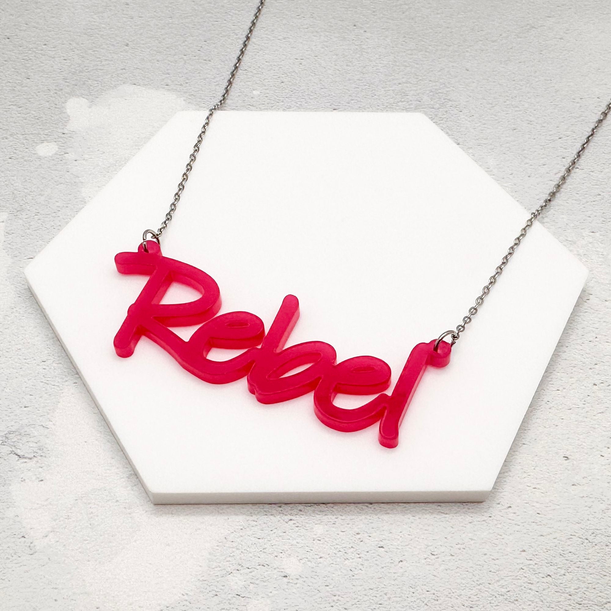 This handmade rebel necklace is a bold acrylic statement piece designed to celebrate empowerment and self-expression. Lightweight yet impactful, it’s finished with a durable stainless steel chain and made to stand out with any outfit — from everyday wear to statement protests.