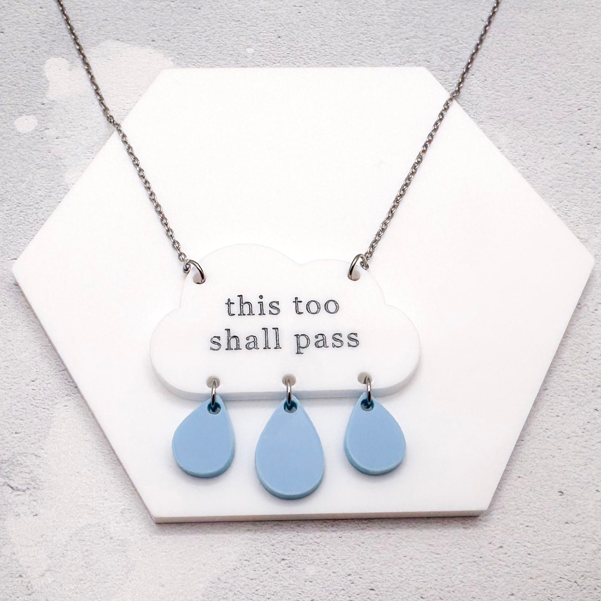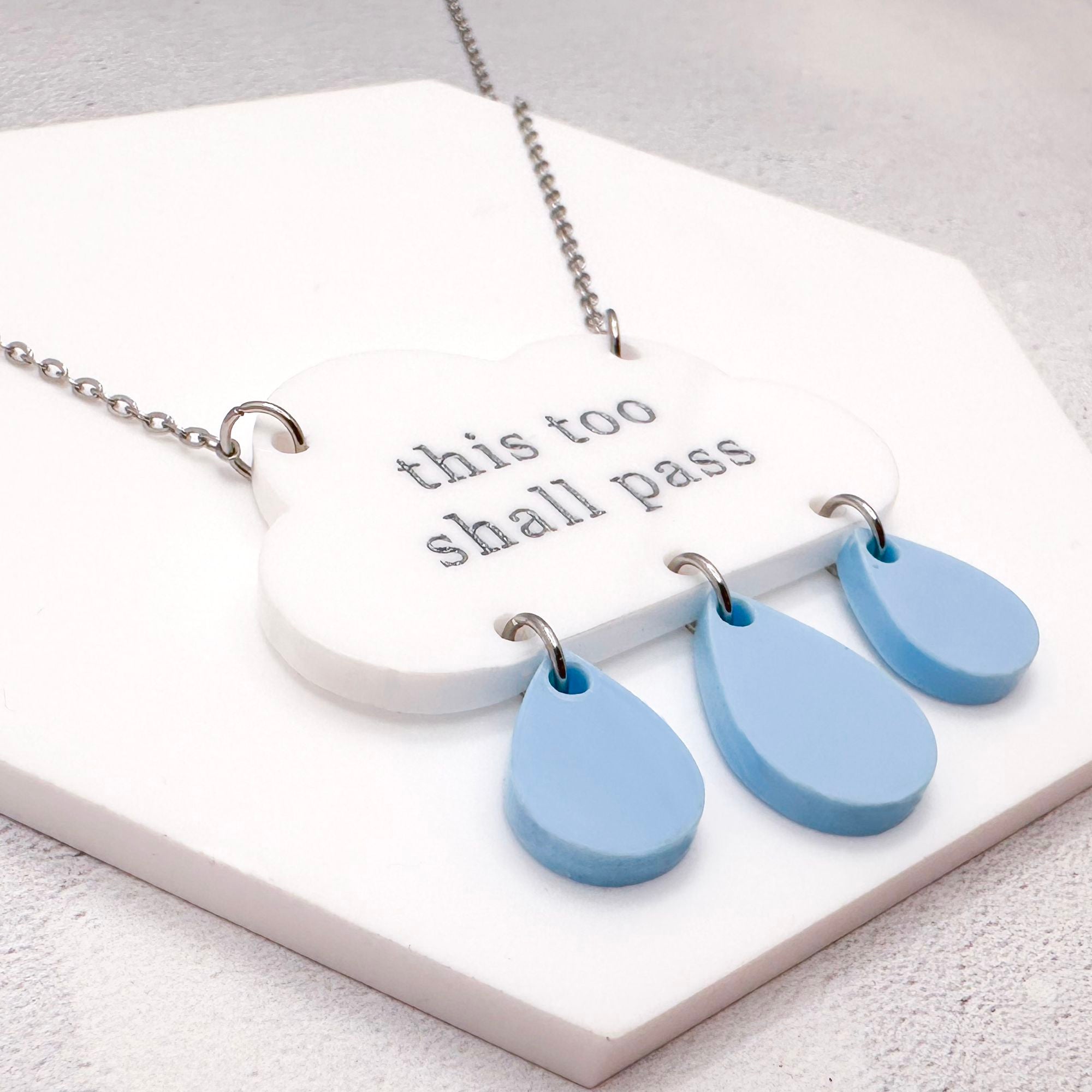 Carry a message of hope wherever you go with this handmade “This Too Shall Pass” necklace. Featuring a hand-painted acrylic cloud with delicate raindrop details, this lightweight statement piece is finished with a stainless steel chain and designed for everyday wear. A meaningful gift for mental health support, encouragement, or self-care.