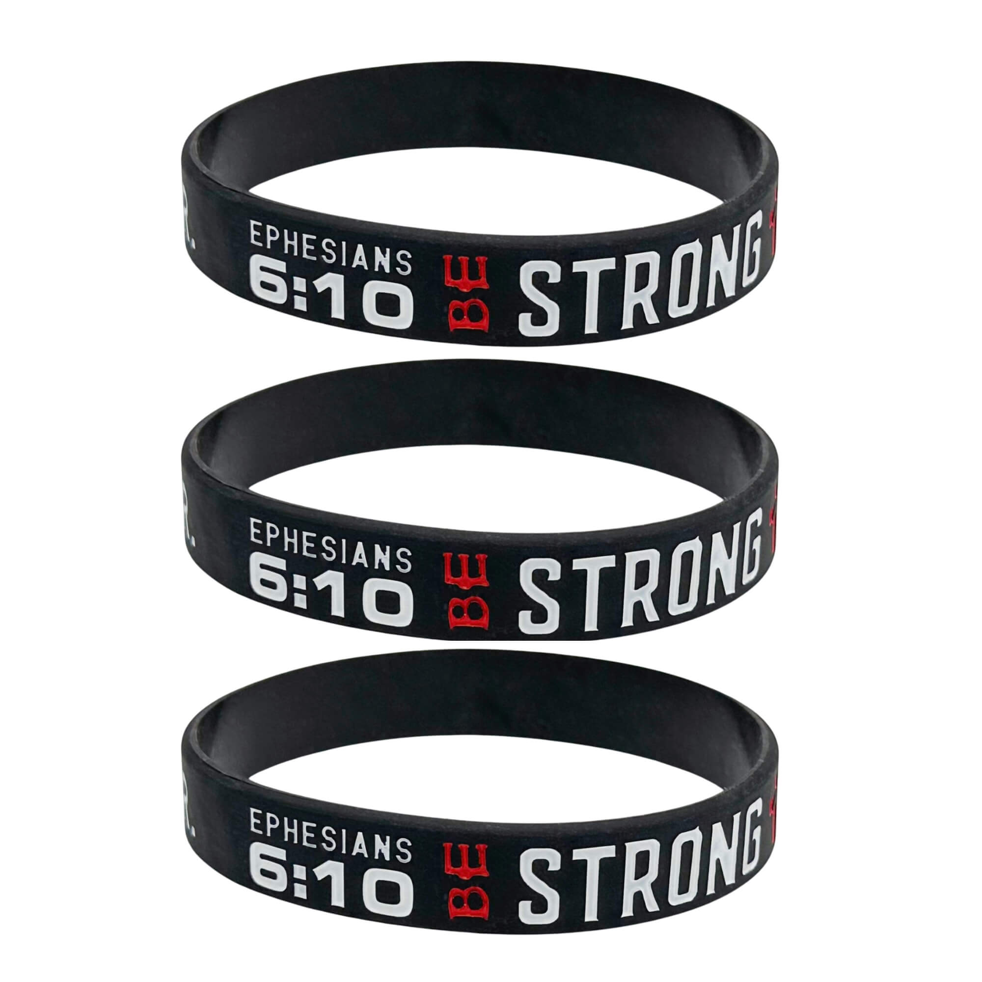 This bible verse bracelet is perfect for expressing your faith! It's a black silicone band with white and red lettering that reads: Ephesians 6:10 Be Strong In The Lord & In His Mighty Power.