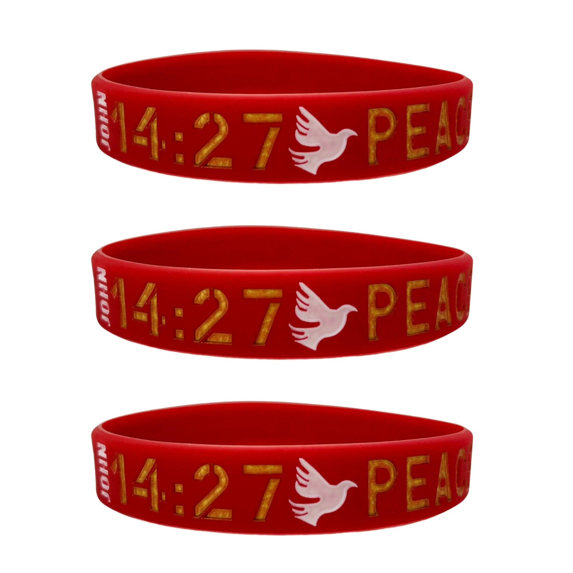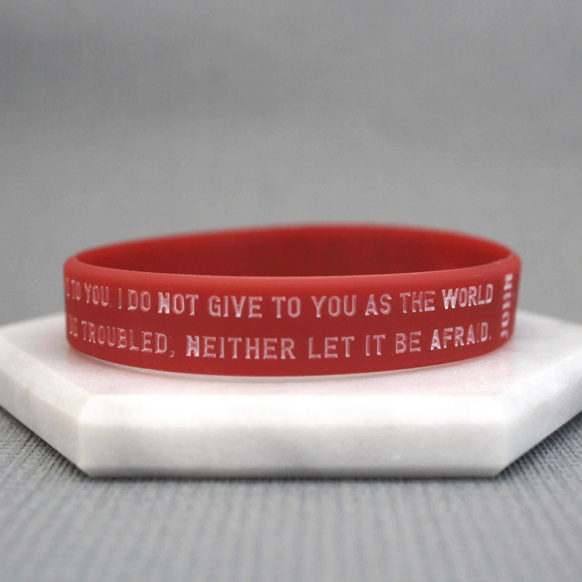 This bible verse bracelet is perfect for expressing your faith! It's a red silicone band with white and gold lettering that reads: John 14:27 // Peace I leave with you; my peace I give to you. // I do not give to you as the world gives. // Do not let your heart be troubled, neither let it be afraid.