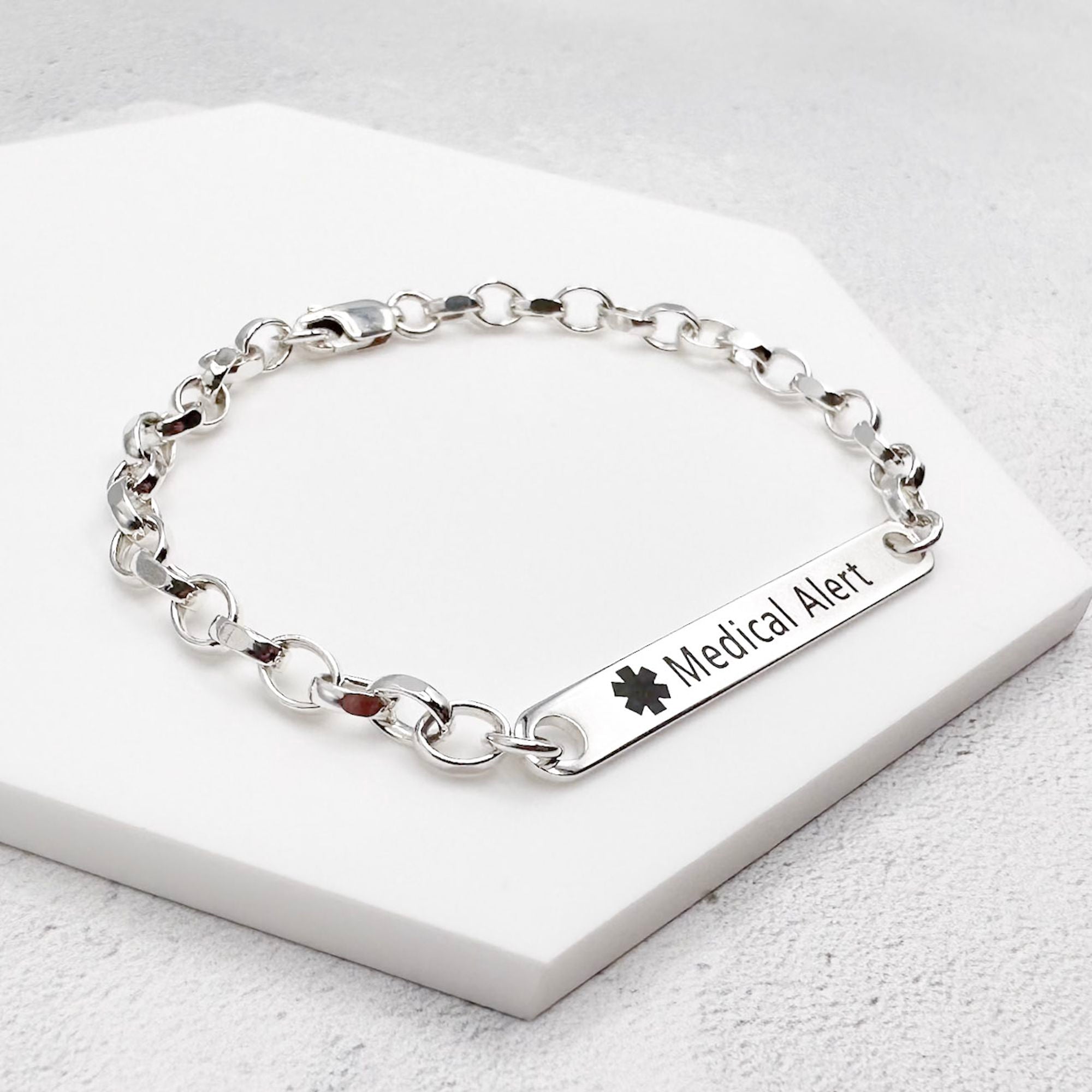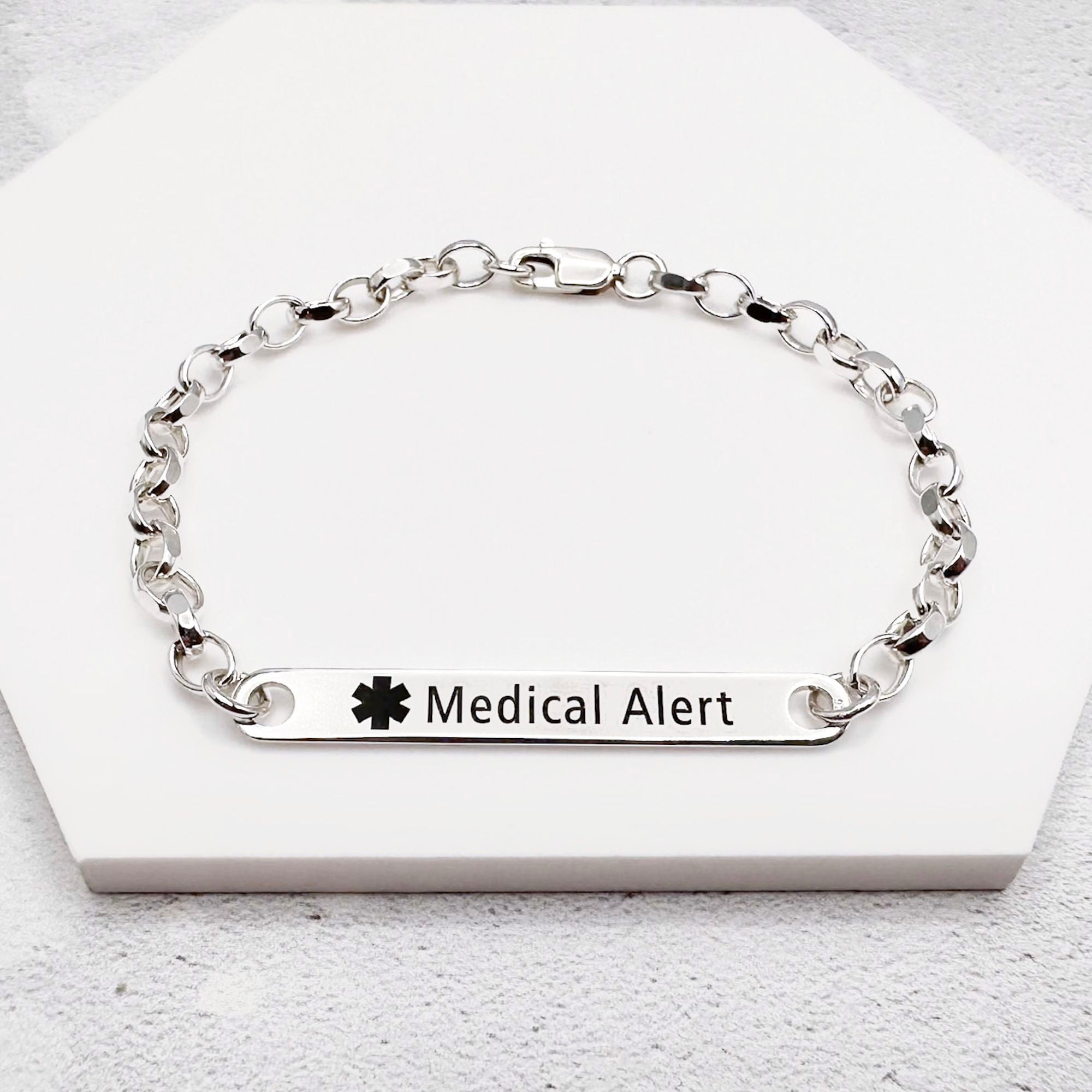 Make a stylish statement with this silver medical alert bracelet! This modern .925 bracelet features a slim bar charm for your medical conditions, allergies, or emergency contact details.