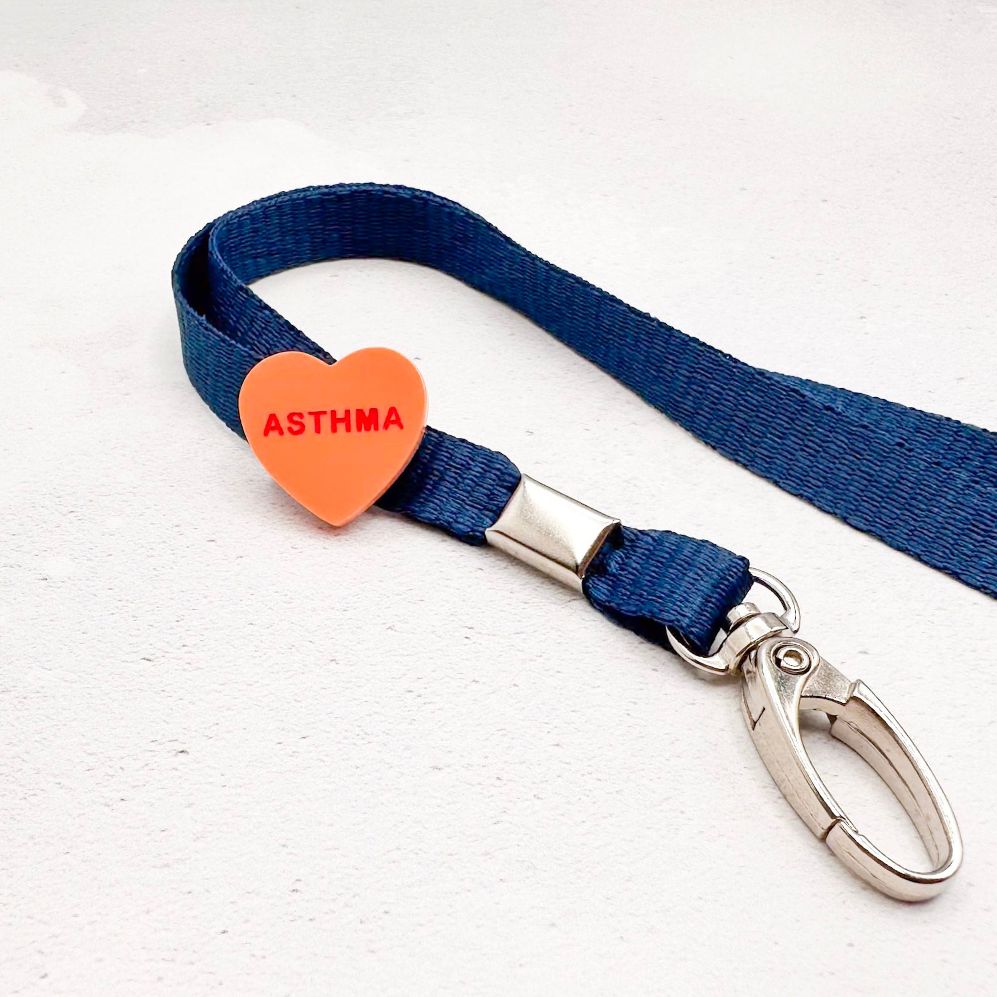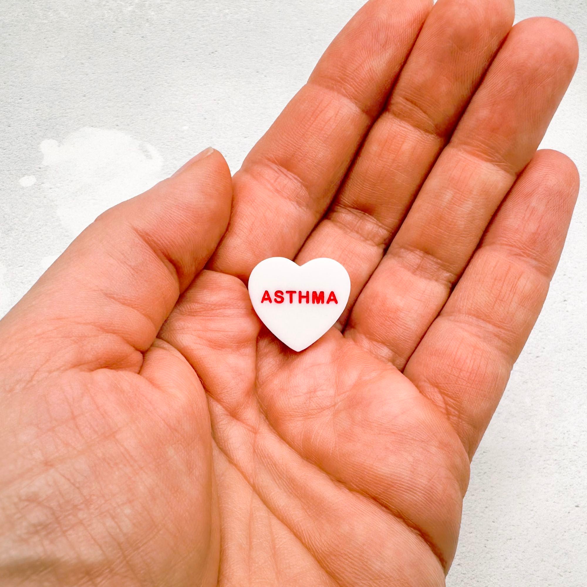 Raise awareness to your medical condition with this charming asthmatic awareness heart pin. It features hand-painted red lettering on an acrylic heart, and a frog style clasp. Choose your colour and add a rubber clasp for extra security if desired.