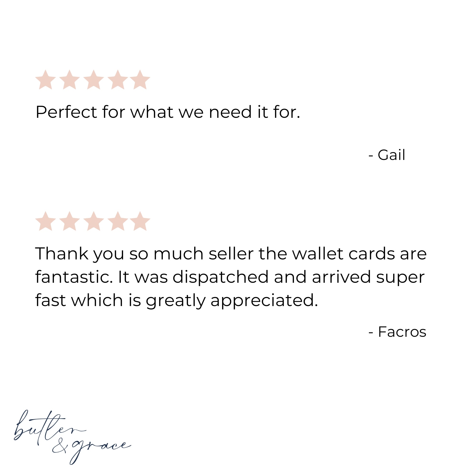 Measure the slots in your wallet or purse to ensure these card will fit. Each card is 85mm wide x 55mm tall.