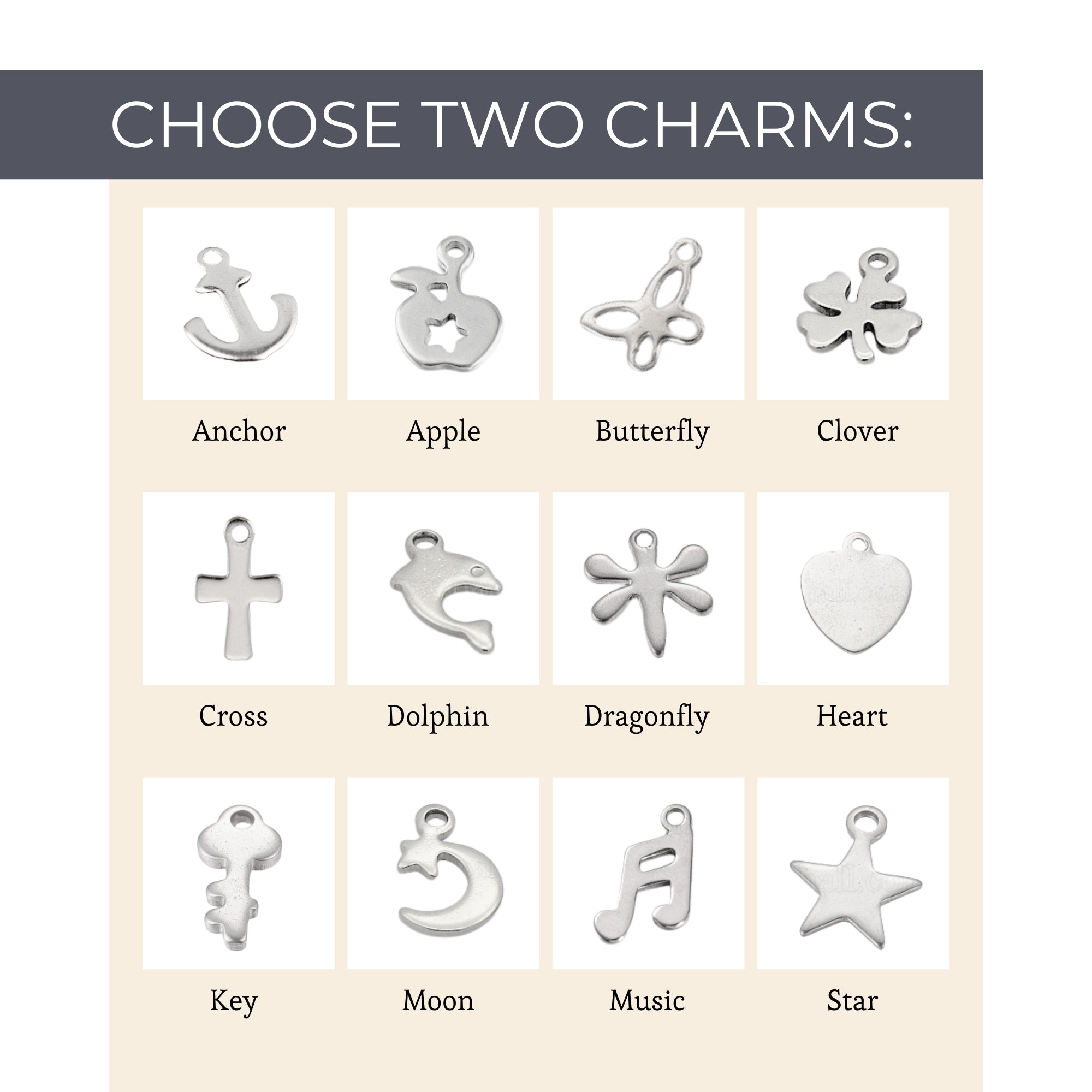 This customised bracelet for her features two tiny charms of your choice, and a personalised charm for your special message. Made from high-quality stainless steel, this customised bracelet for her offers a beautiful and durable finish.