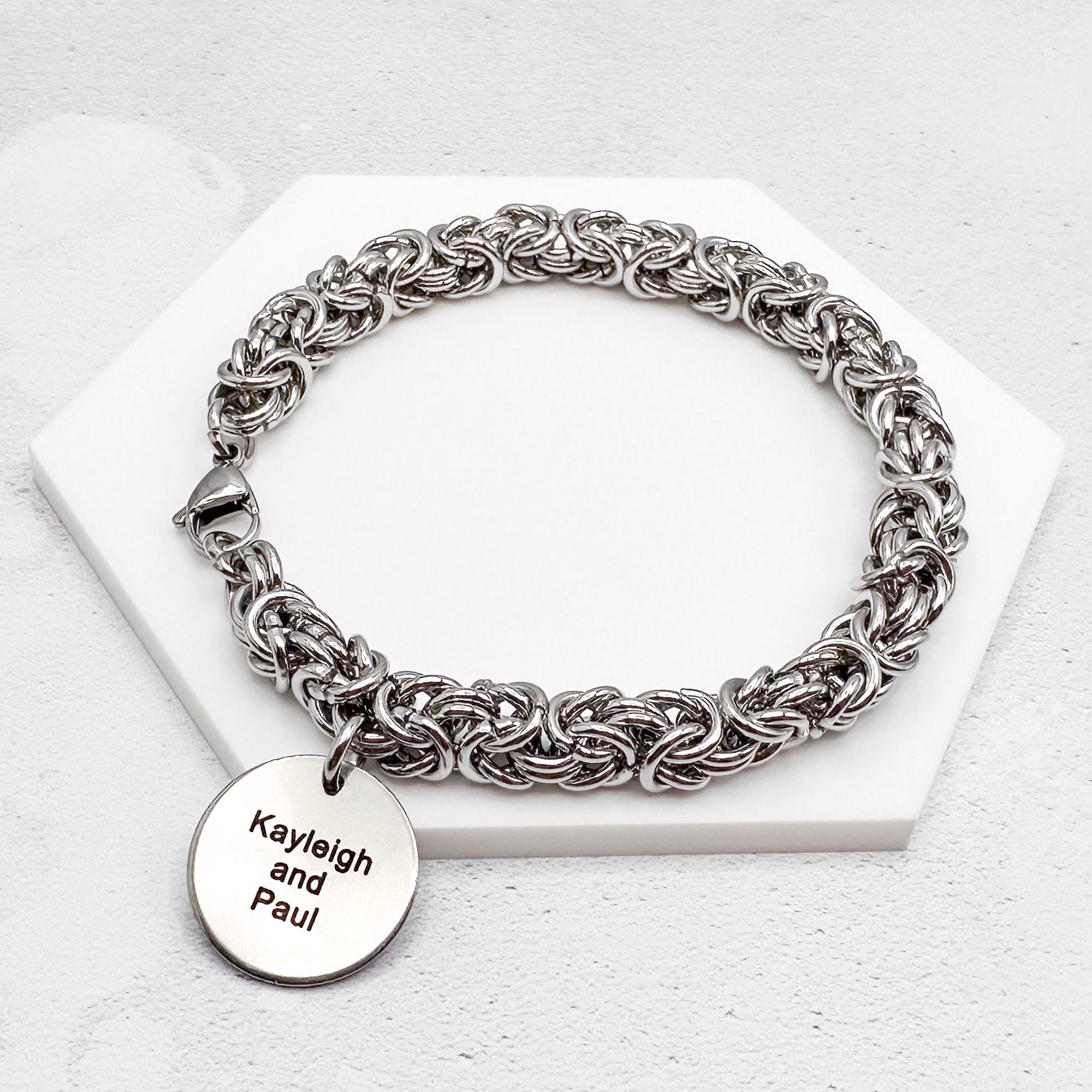 This ladies customised bracelet features a substantial style byzantine weave chain, and a stainless steel charm for your special message. Made from high-quality stainless steel, this ladies customised bracelet offers a beautiful and durable finish.