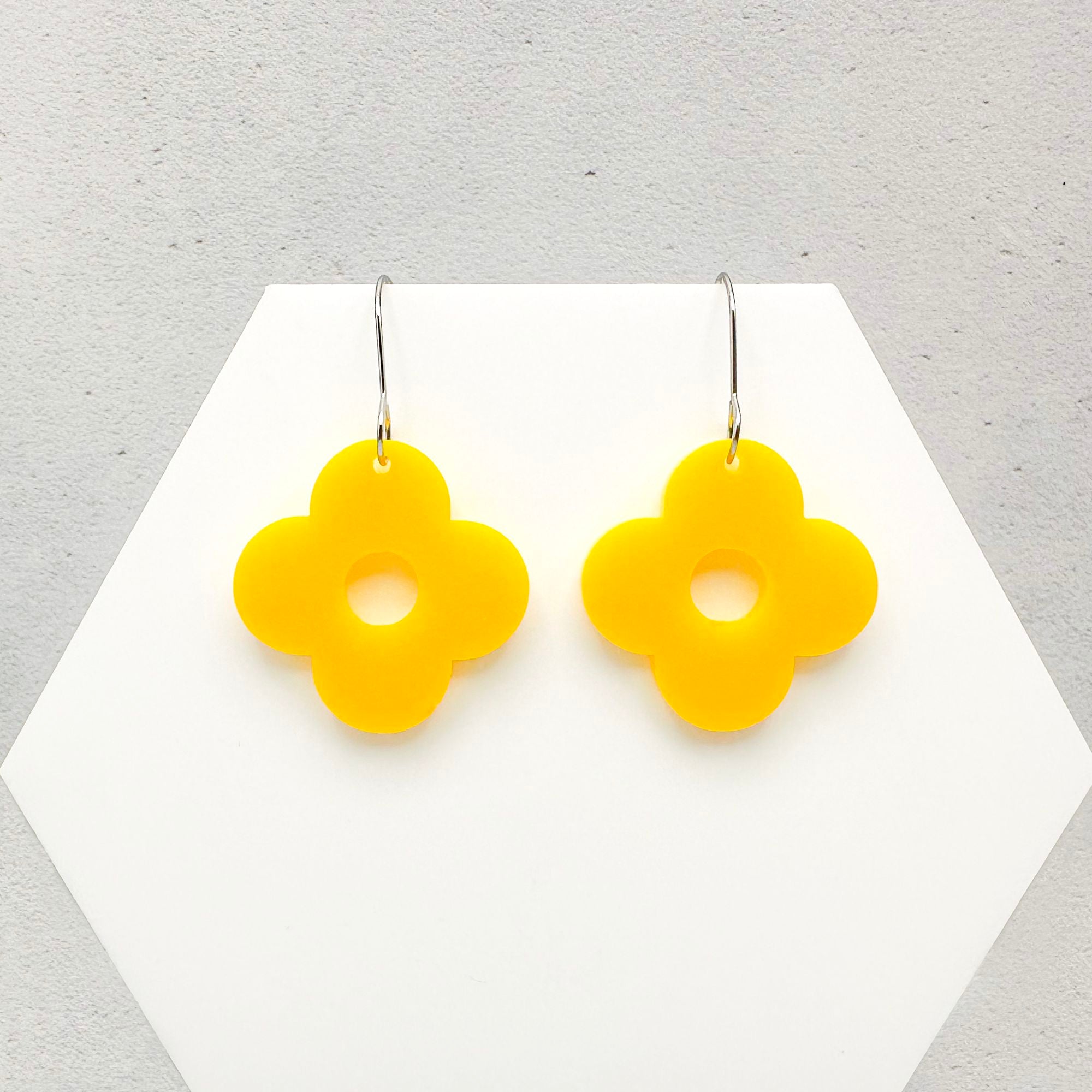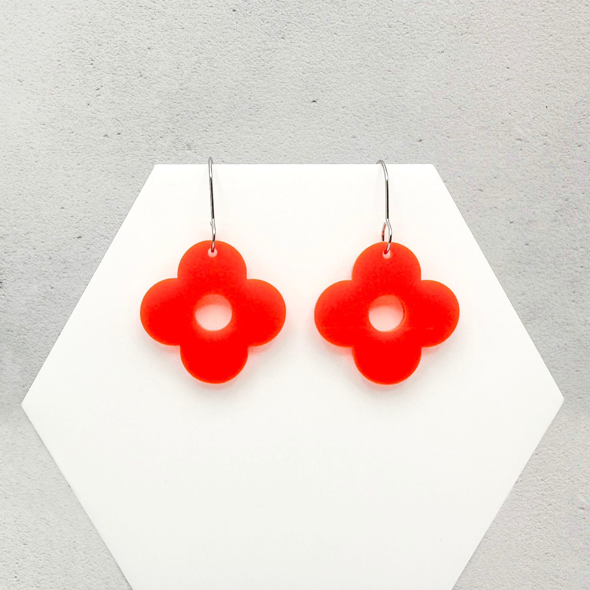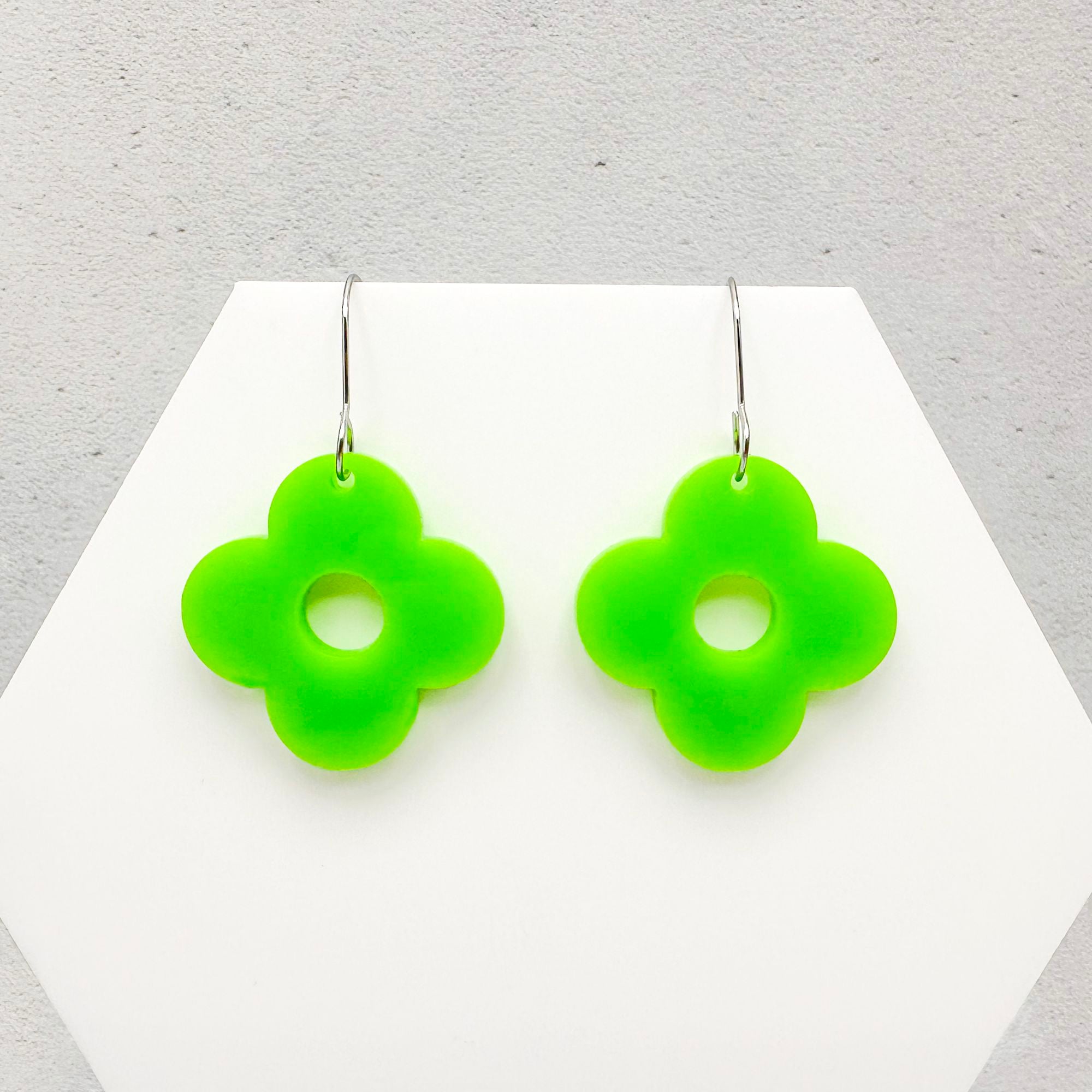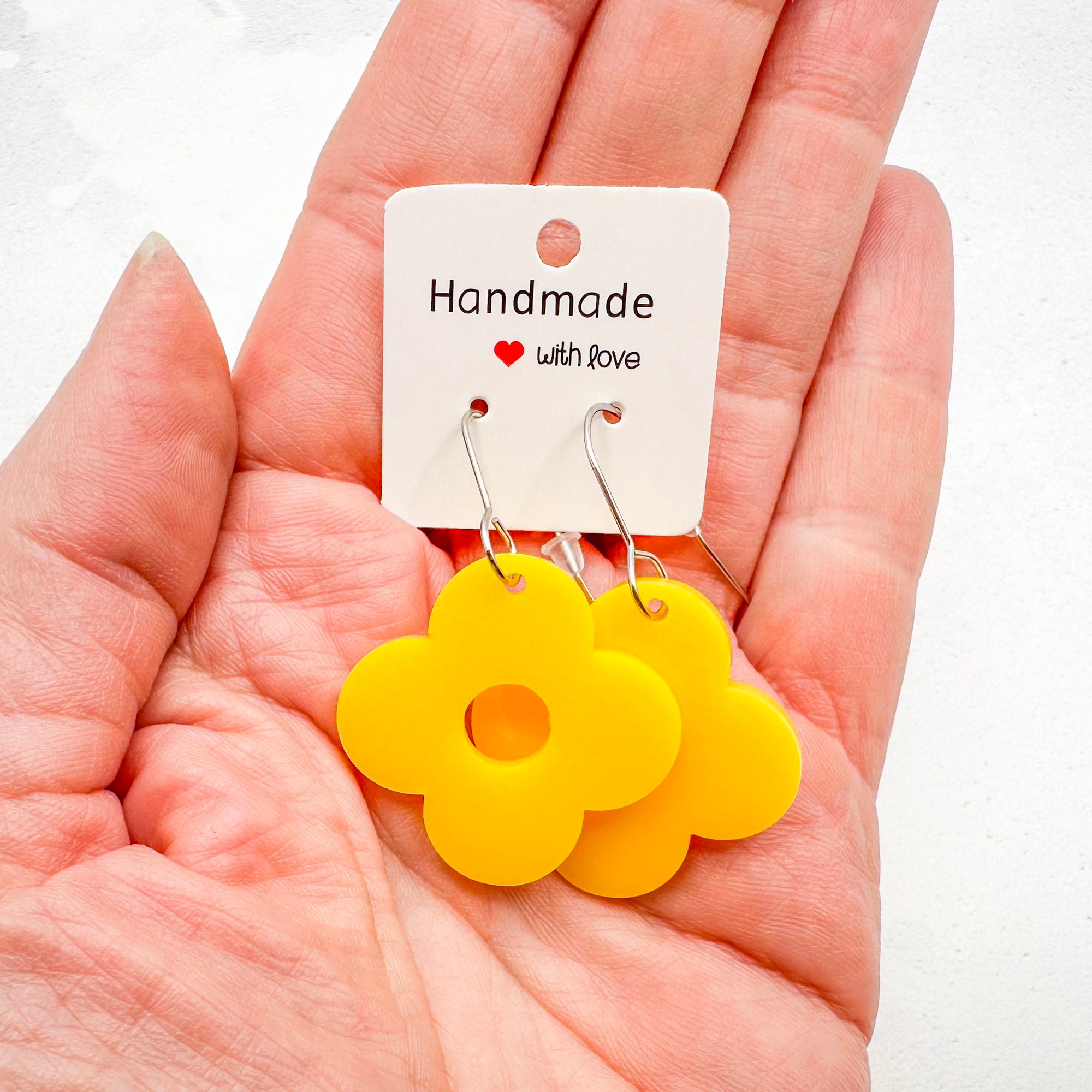 These 60s retro flower earrings are a bold, handmade accessory that adds a groovy touch to any outfit. Crafted from high-quality 3mm laser-cut acrylic, each pair features a vibrant 4-petal flower design in five eye-catching colours: white, yellow, orange, hot pink, and lime green.