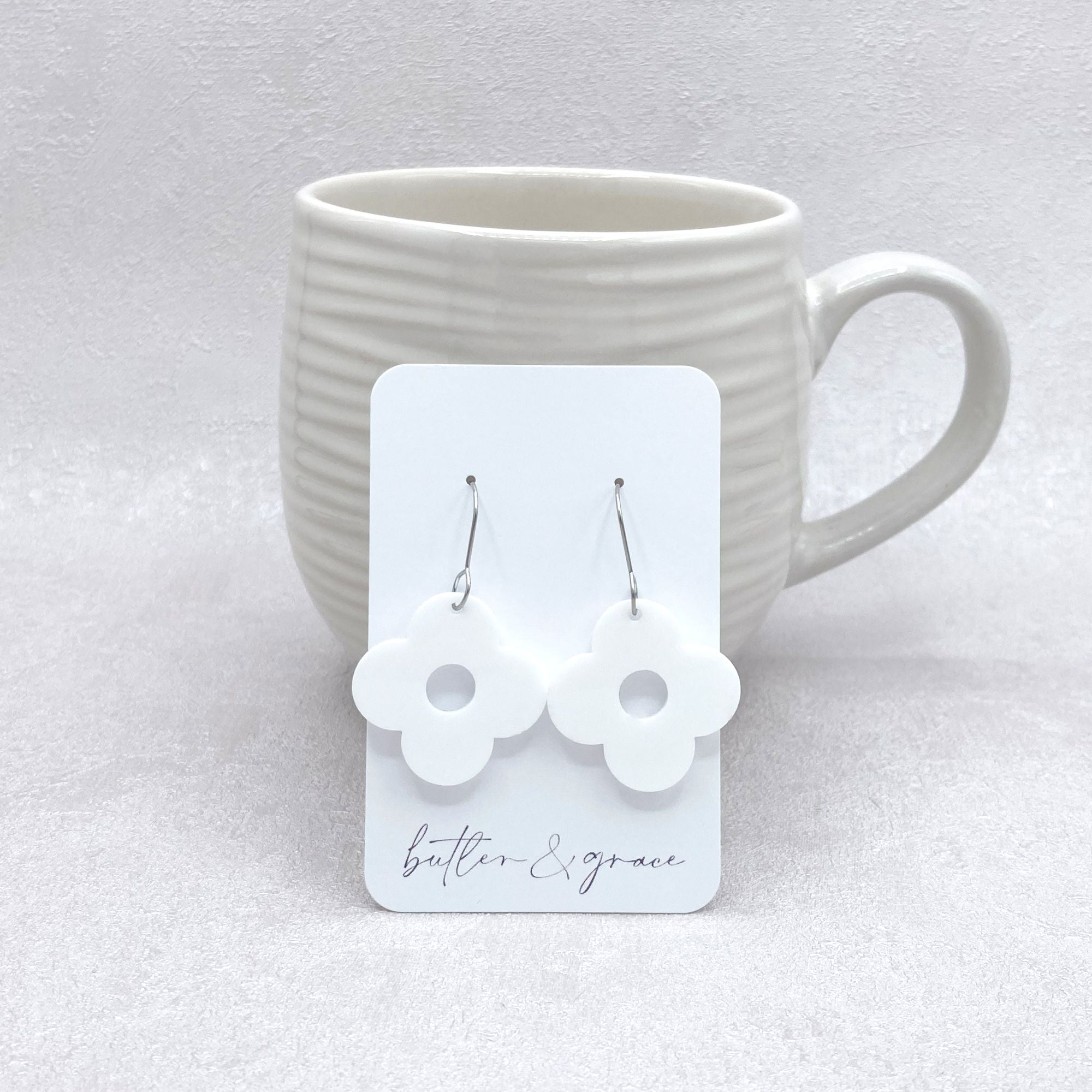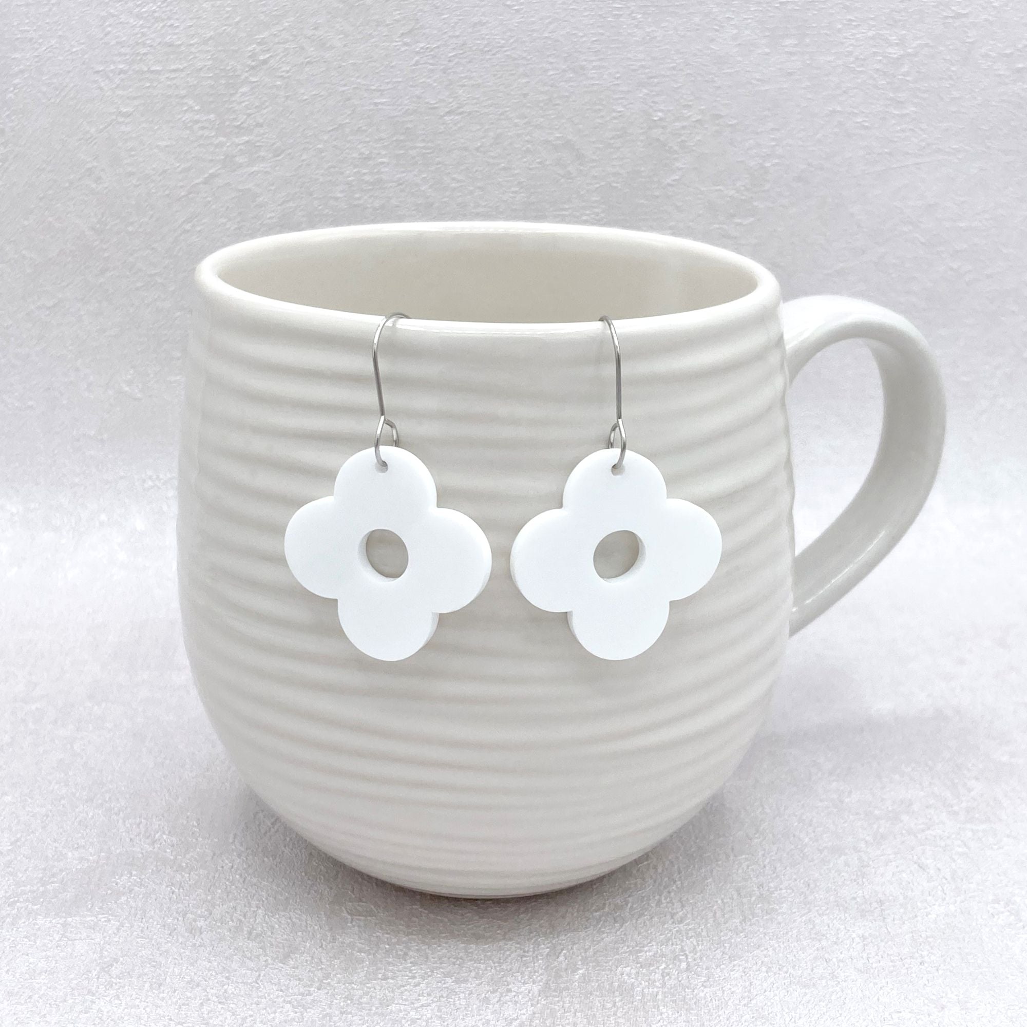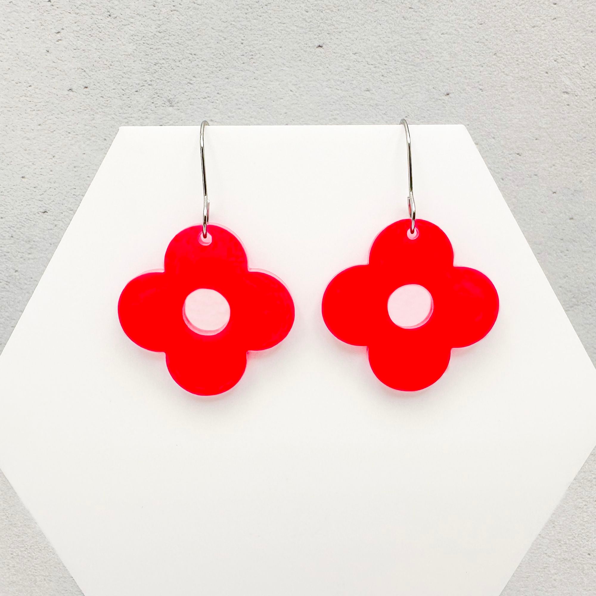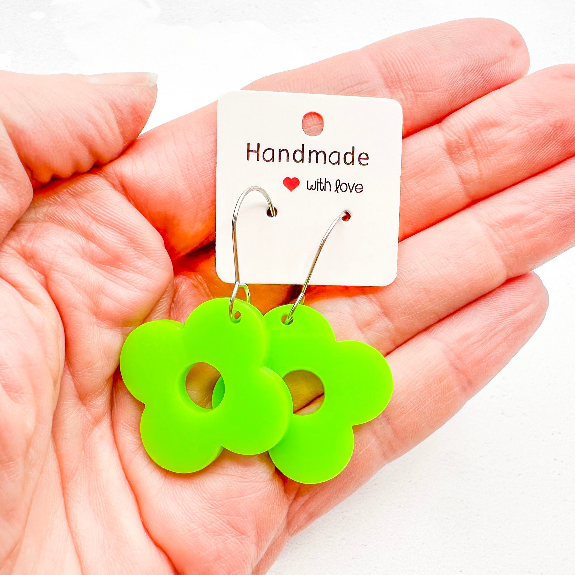 These 60s retro flower earrings are a bold, handmade accessory that adds a groovy touch to any outfit. Crafted from high-quality 3mm laser-cut acrylic, each pair features a vibrant 4-petal flower design in five eye-catching colours: white, yellow, orange, hot pink, and lime green.