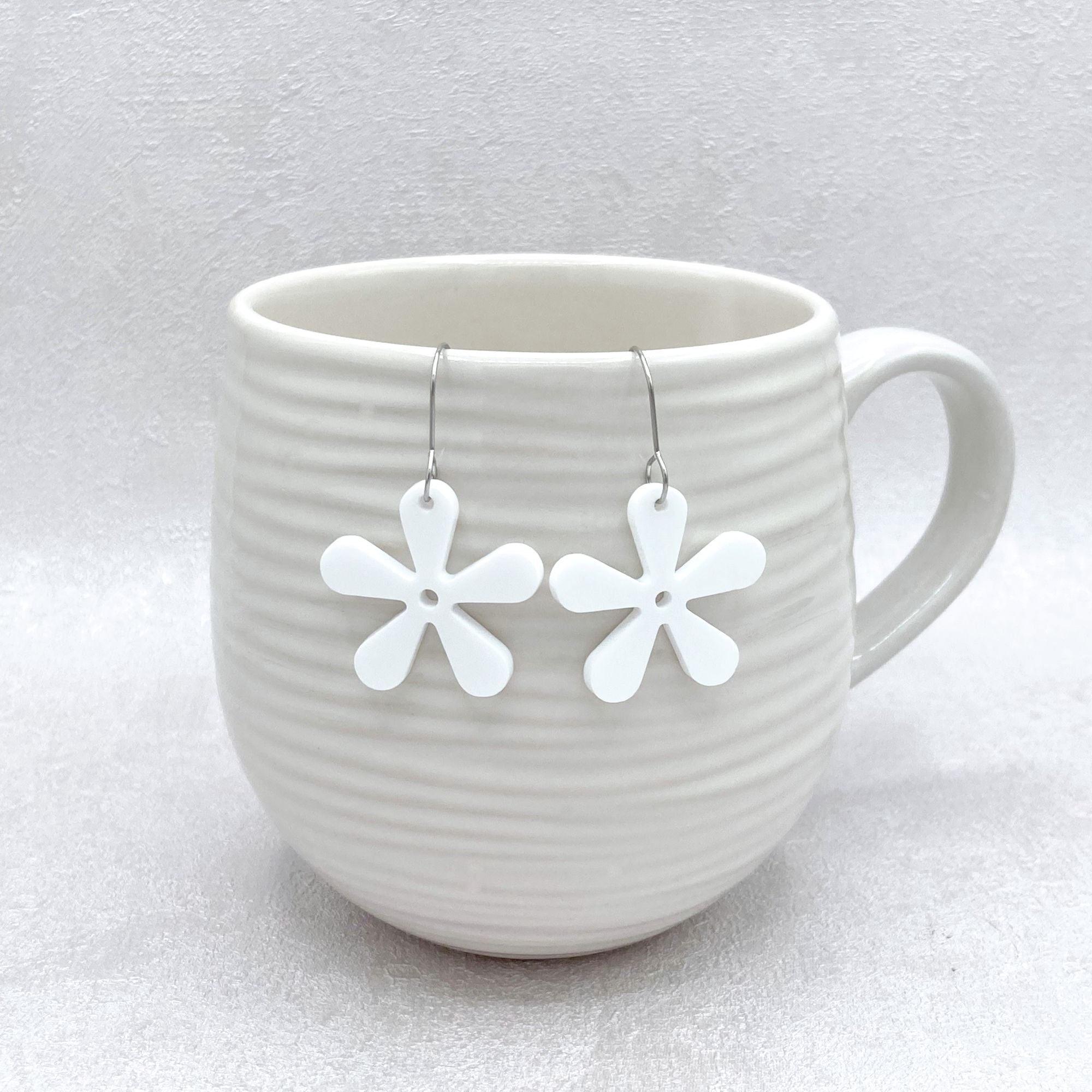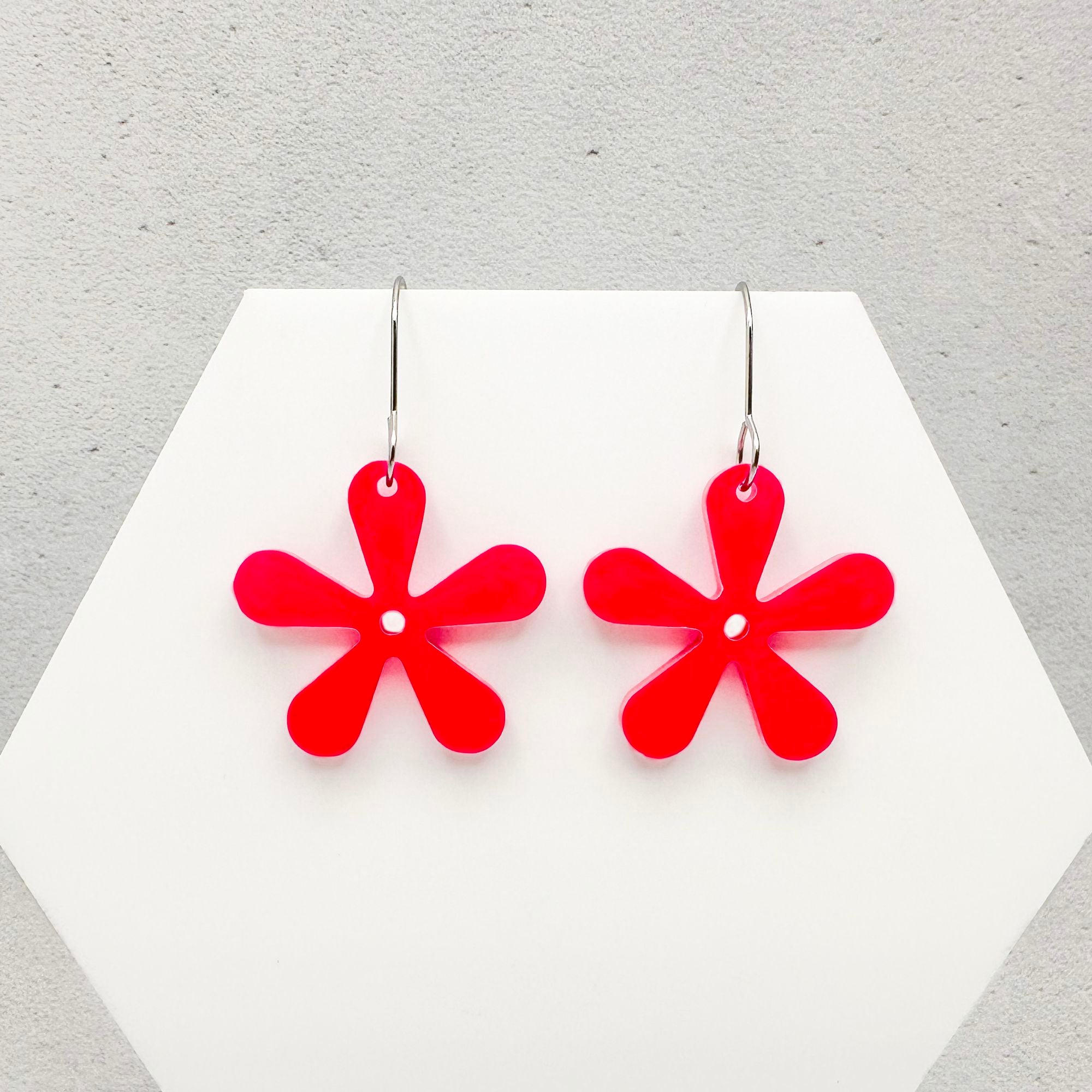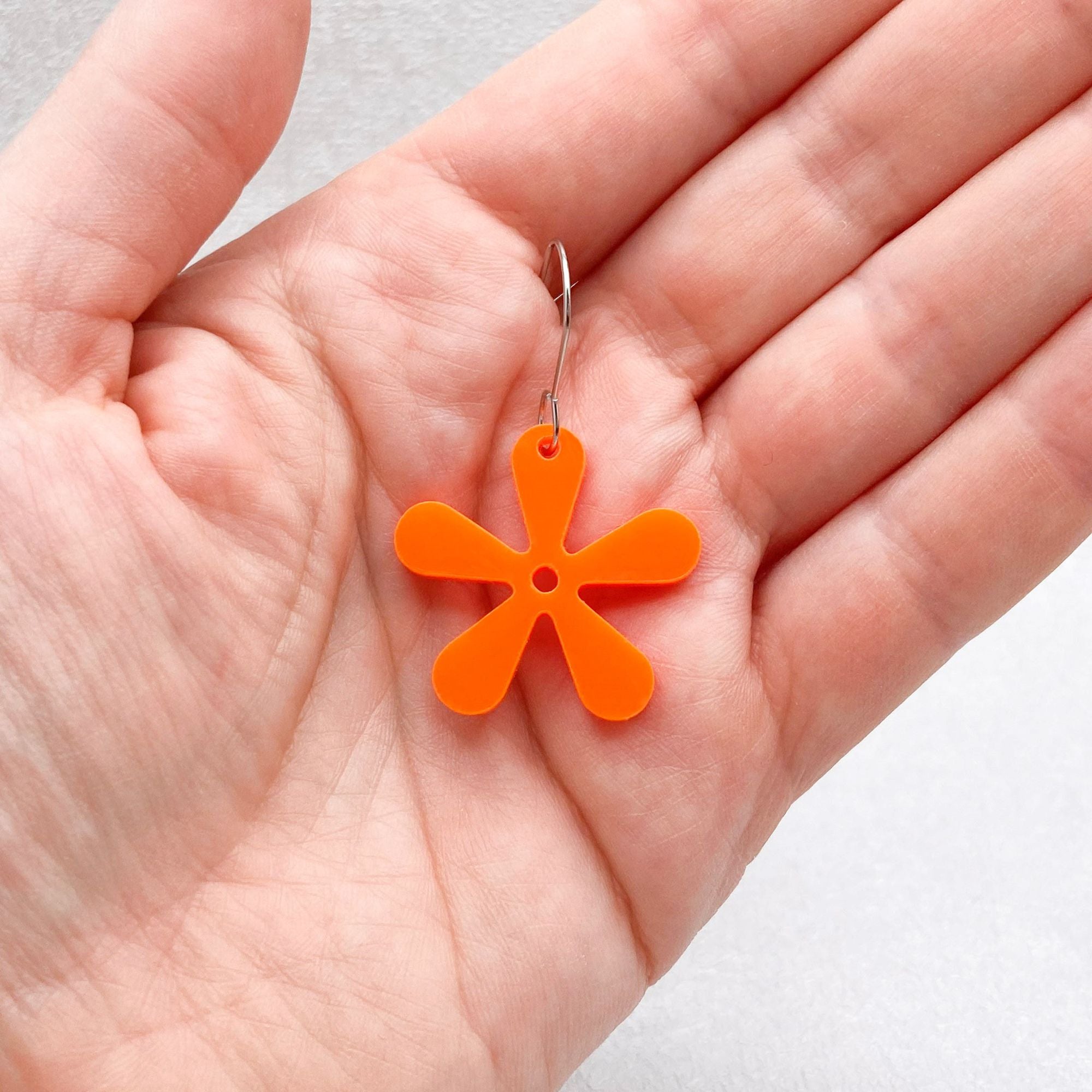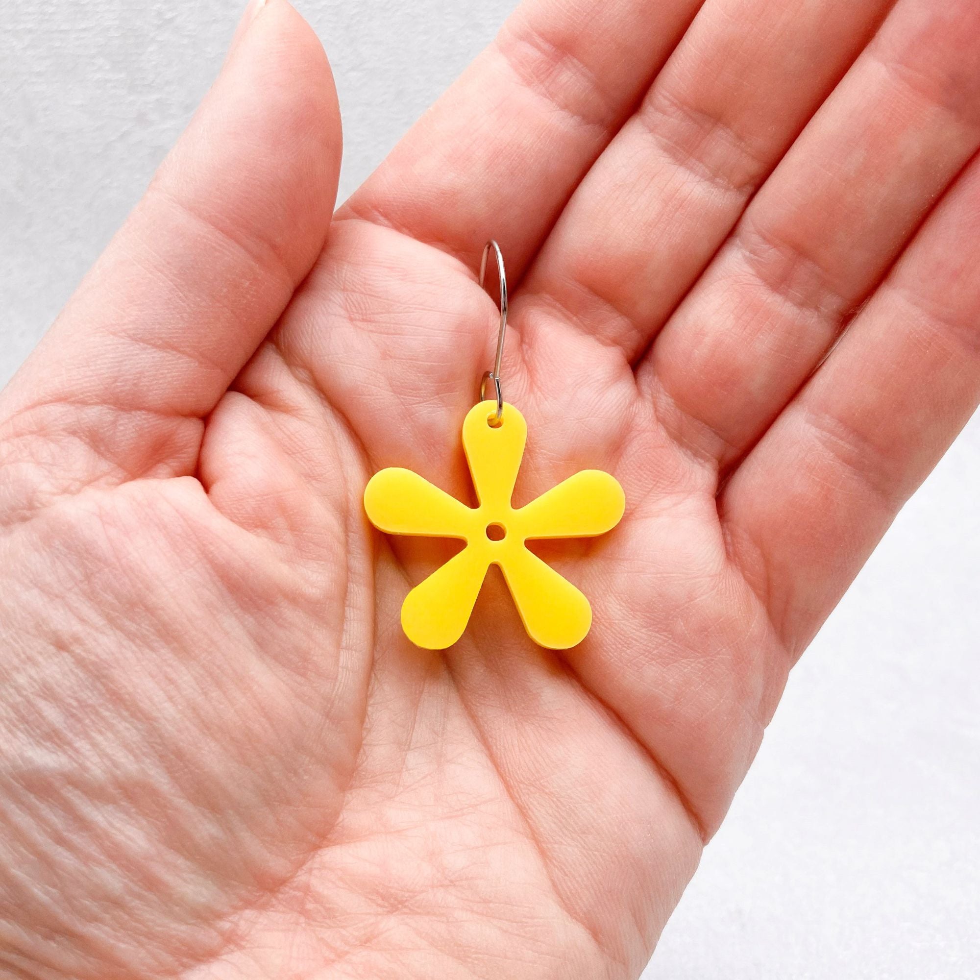 These 60s retro flower earrings are a bold, handmade accessory that adds a groovy touch to any outfit. Crafted from high-quality 3mm laser-cut acrylic, each pair features a vibrant 5-petal flower design in five eye-catching colours: white, yellow, orange, hot pink, and lime green.