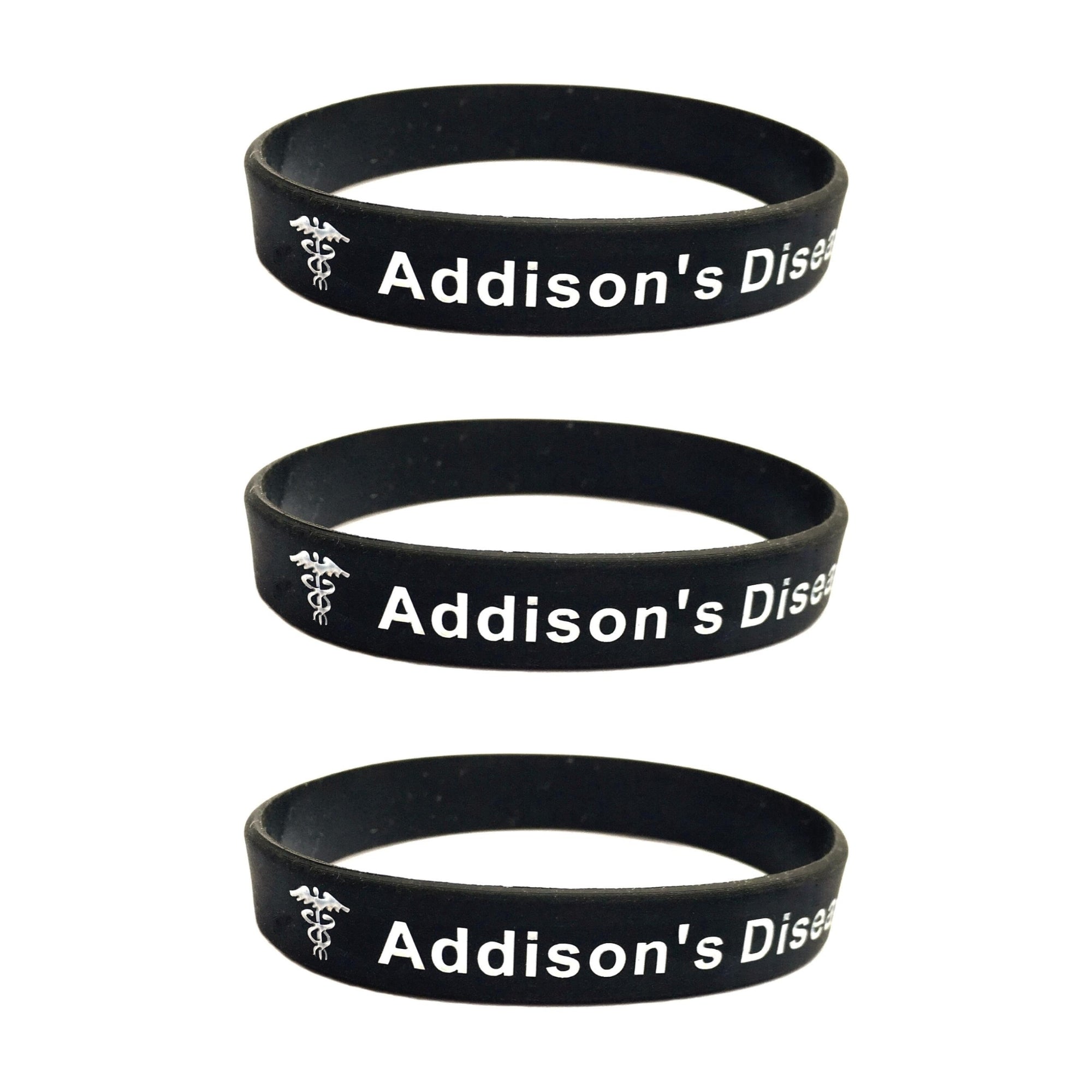 This addison's disease bracelet features a black band with a white caduceus medical symbol and text. Debossed and colour-filled, this addison's disease bracelet is made from 100% latex-free silicone and is perfect for sports, running, or day-to-day wear.