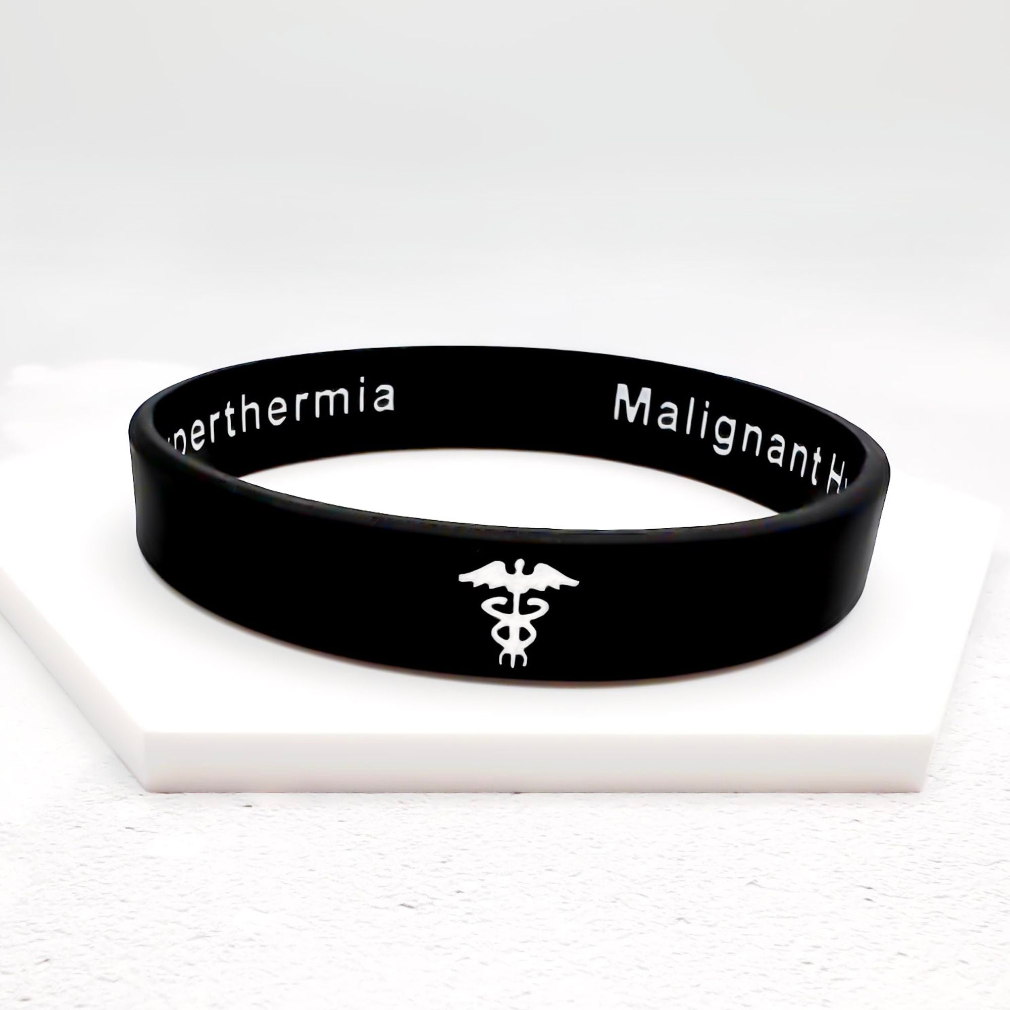 This malignant hyperthermia medical bracelet is discreet and neutral. On the outside, it features the caduceus medical symbol. The inside displays a hidden message: "Malignant Hyperthermia" - visible when the band is flipped over.