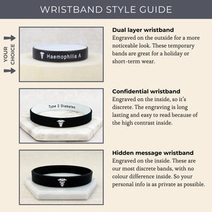 These medical alert silicone wristbands feature a navy blue band with a white under layer. Made from 100% latex-free silicone, these medical alert silicone wristbands are perfect for sports, running, or school.
