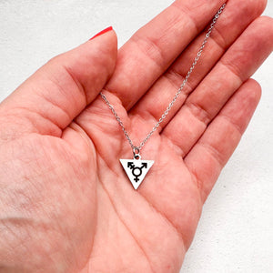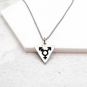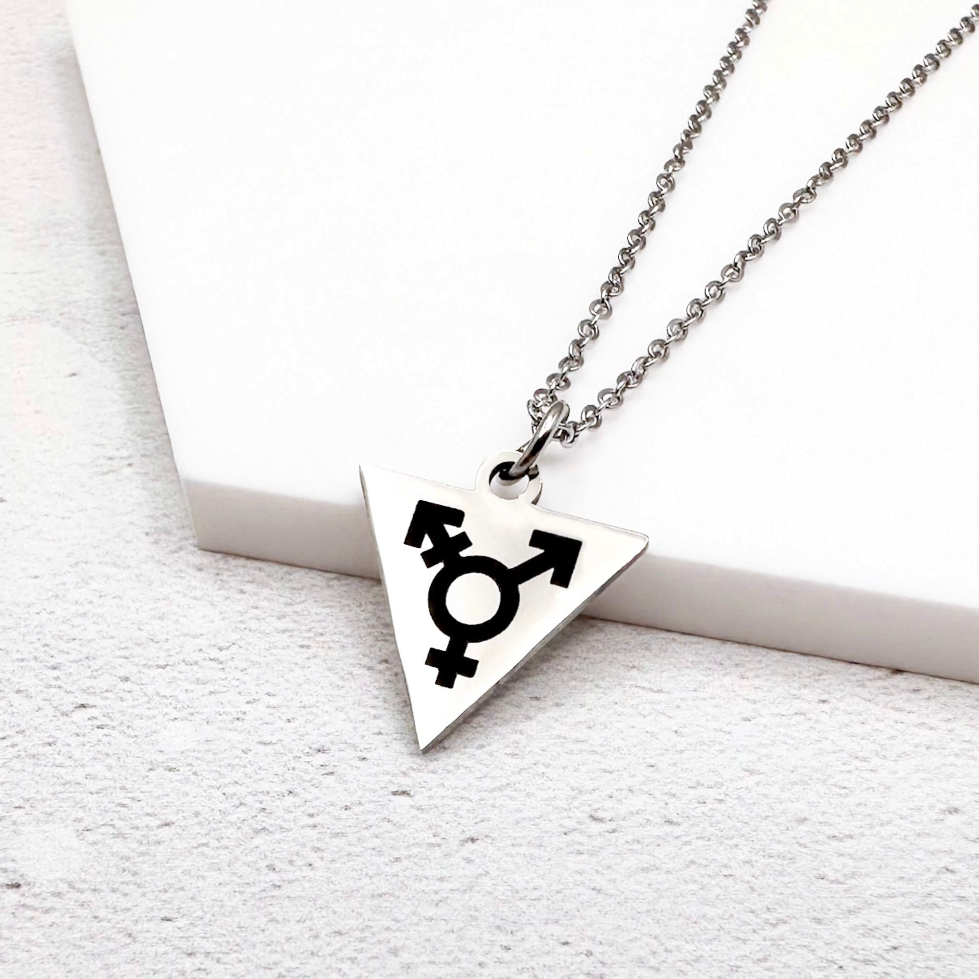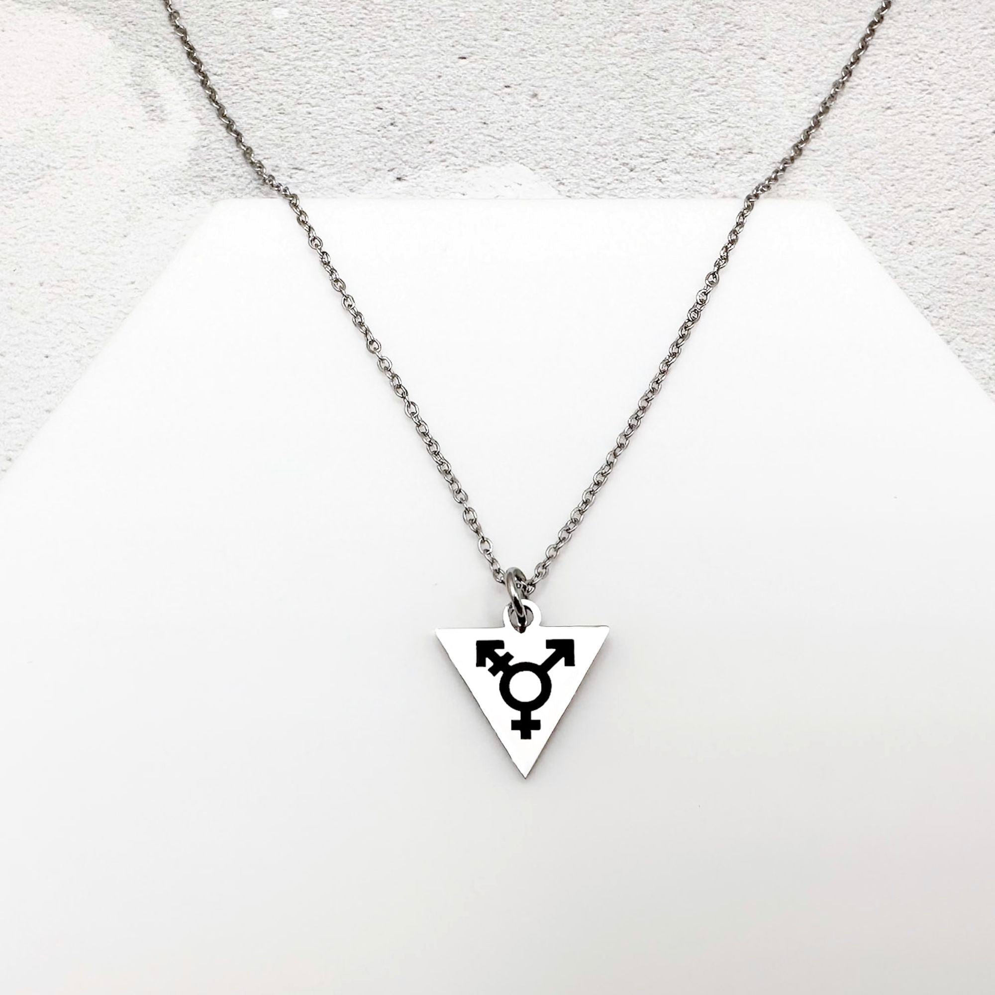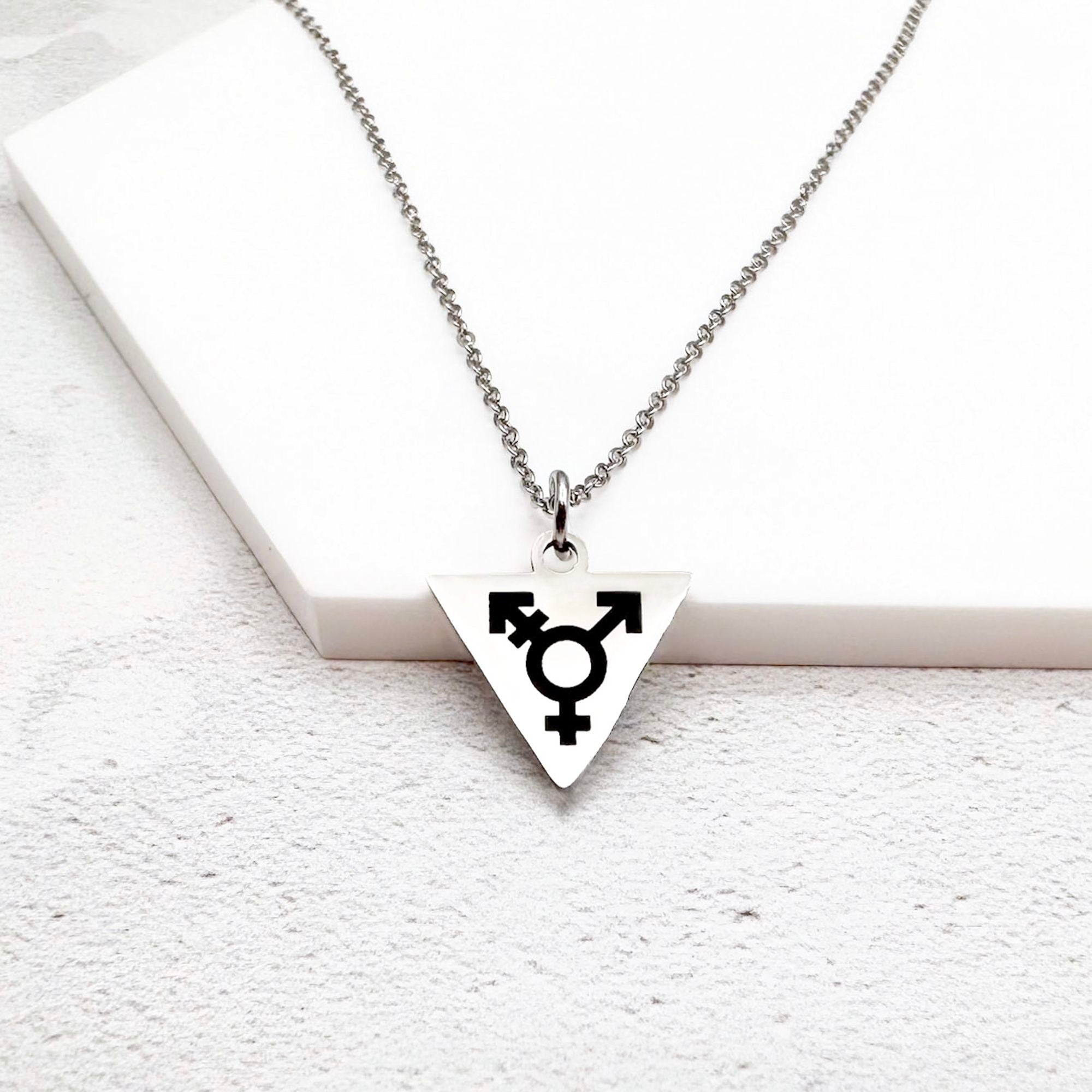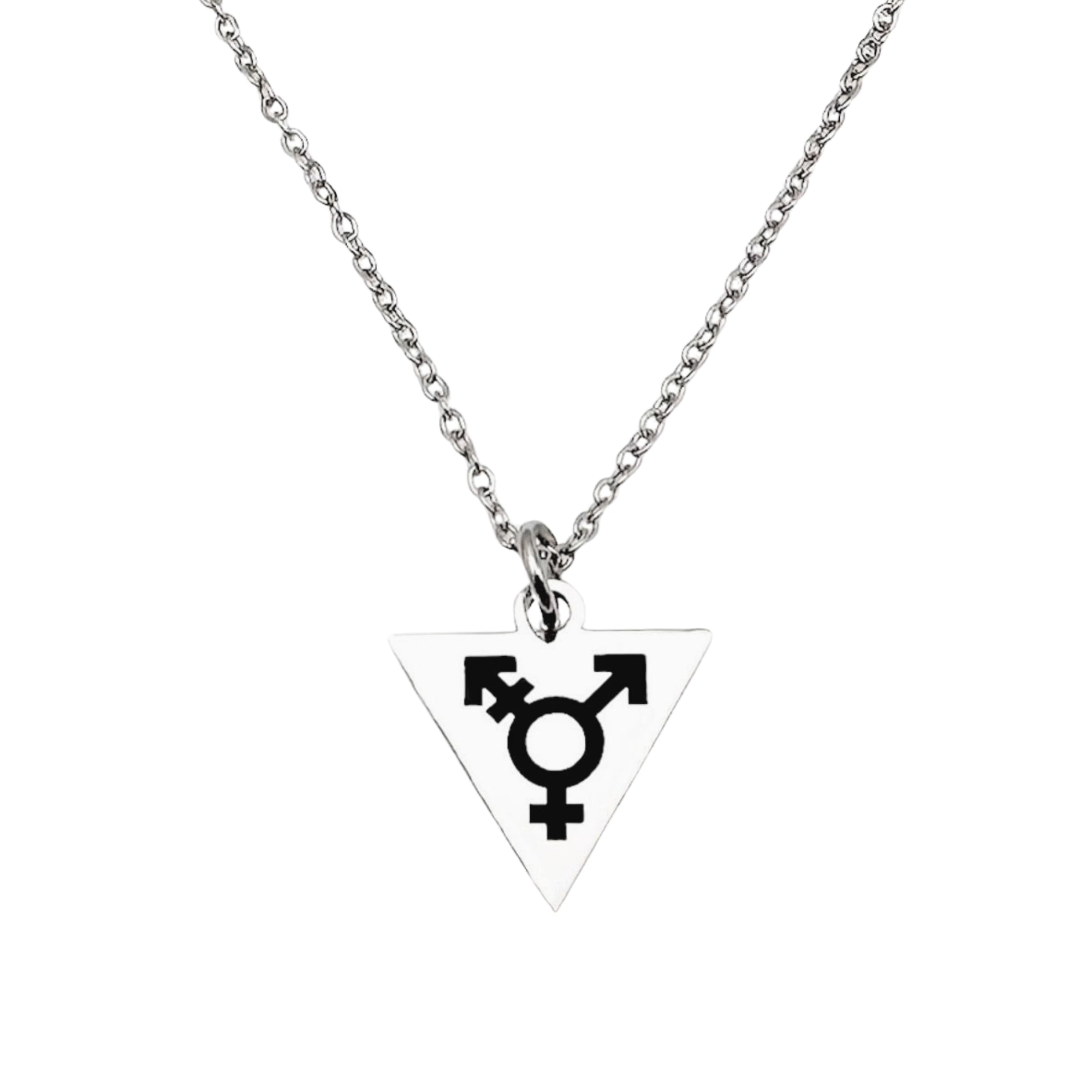 This necklace features a stainless steel triangle pendant engraved with a black transgender symbol on a stainless steel chain. This transgender pride necklace is the perfect gift for you or someone you love.